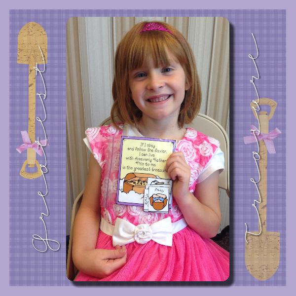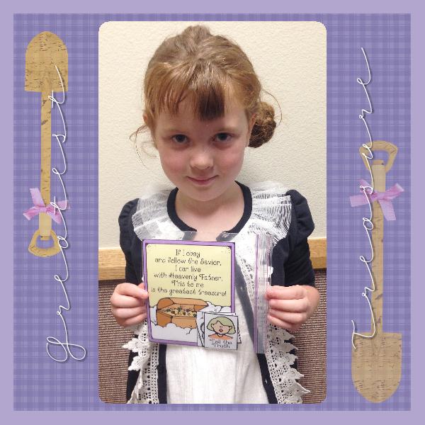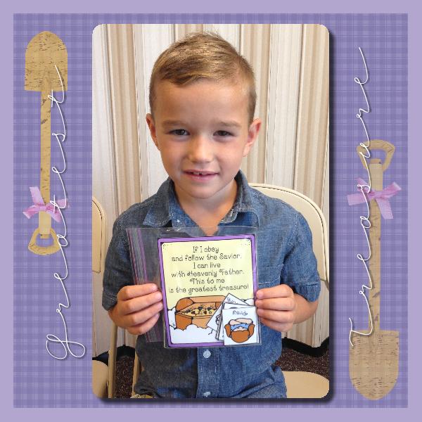 Treasure Hunt: Write clues on the backs of the cards and hide them. When children go to find them, have them go from one to the next, reading the cards aloud as they find them. Then read the clues to the next card. The last card found should lead them to find the large treasure card (shown right): “If I obey and follow the Savior, I can live with Heavenly Father. This to me is the greatest treasure!”