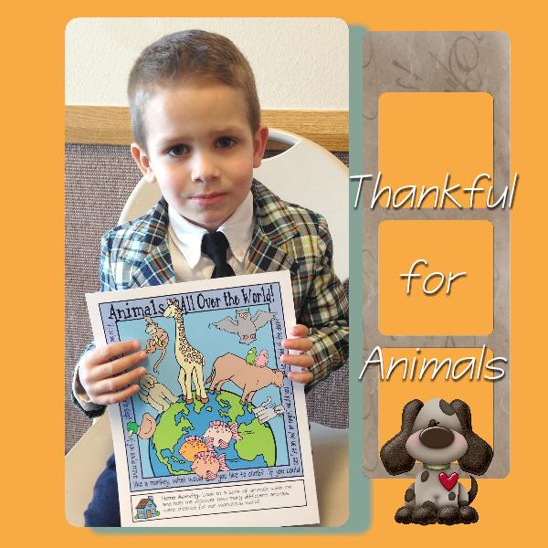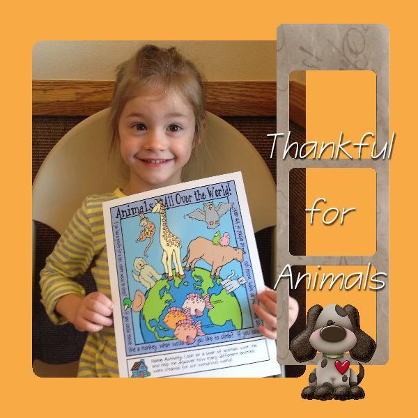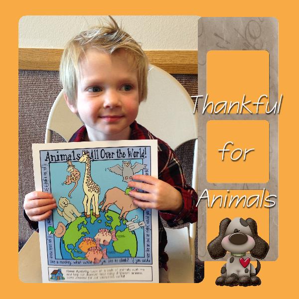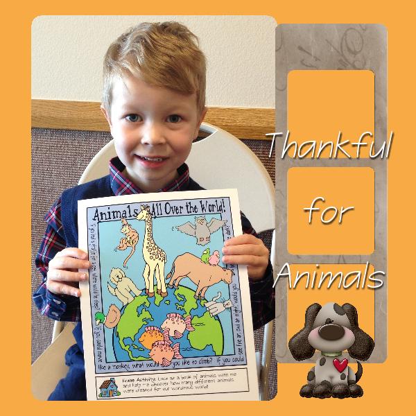 5. Give the children paper and crayons. Let each child draw a picture of his or her favorite animal. Write on each picture I am thankful for animals.